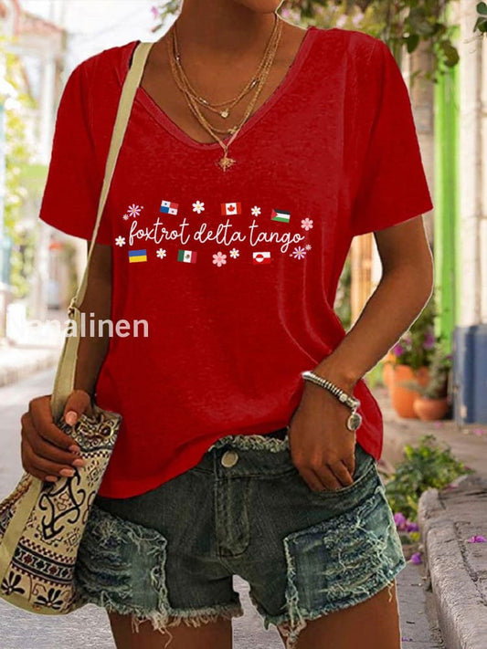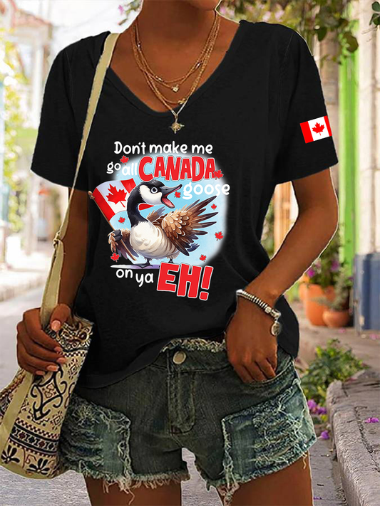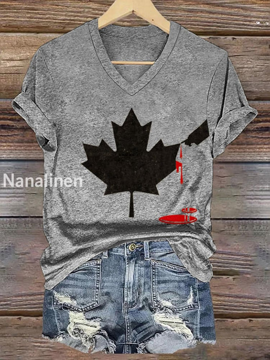Women's Shiny Maple Leaf Print V-Neck T-Shirt