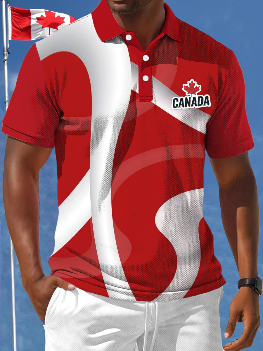 Men's Canadian Maple Leaf Abstract Line Print Casual Business Polo Shirt