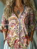 Retro Boho Floral Art Printed Vintage Chic V-Neck Button Cotton Short Sleeve Shirt