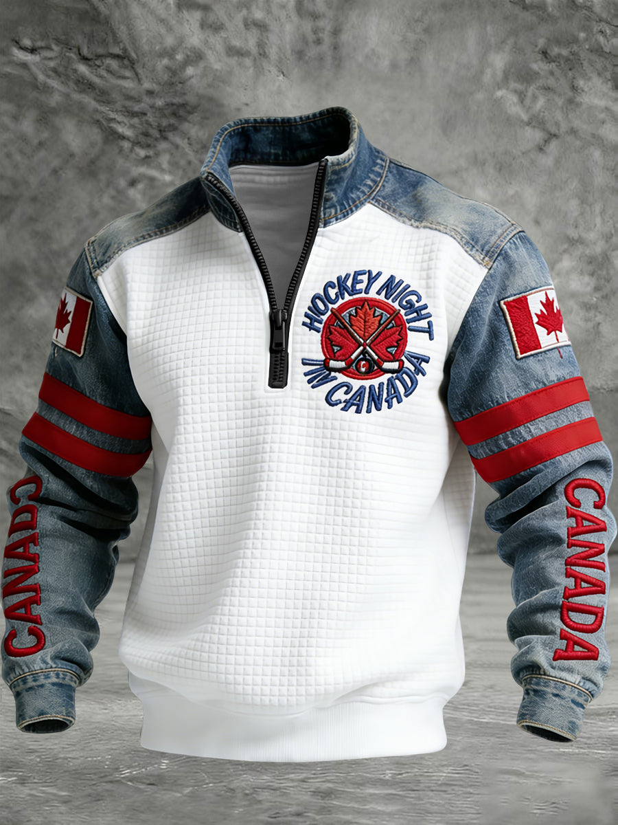 Retro Canadian Hockey Night Patchwork Waffle Knit Pullover