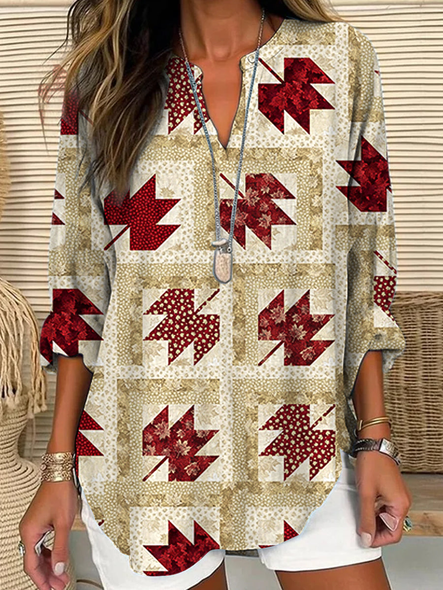 Women's Canadian Geometric Maple Leaf Print Casual V-Neck Top