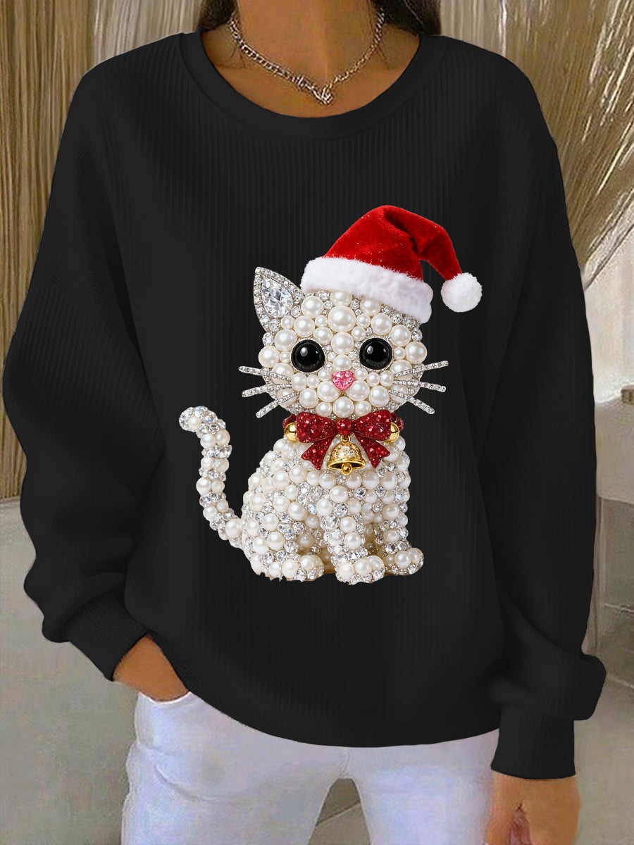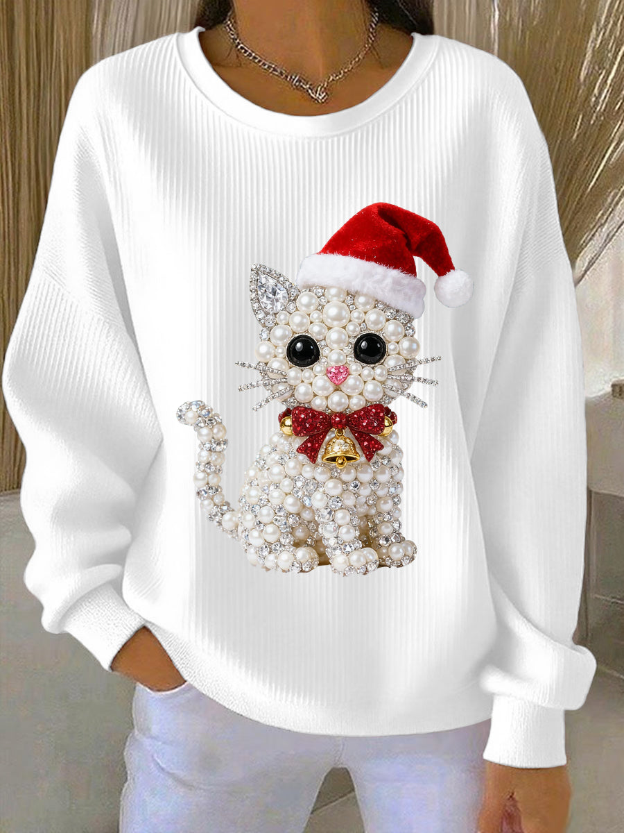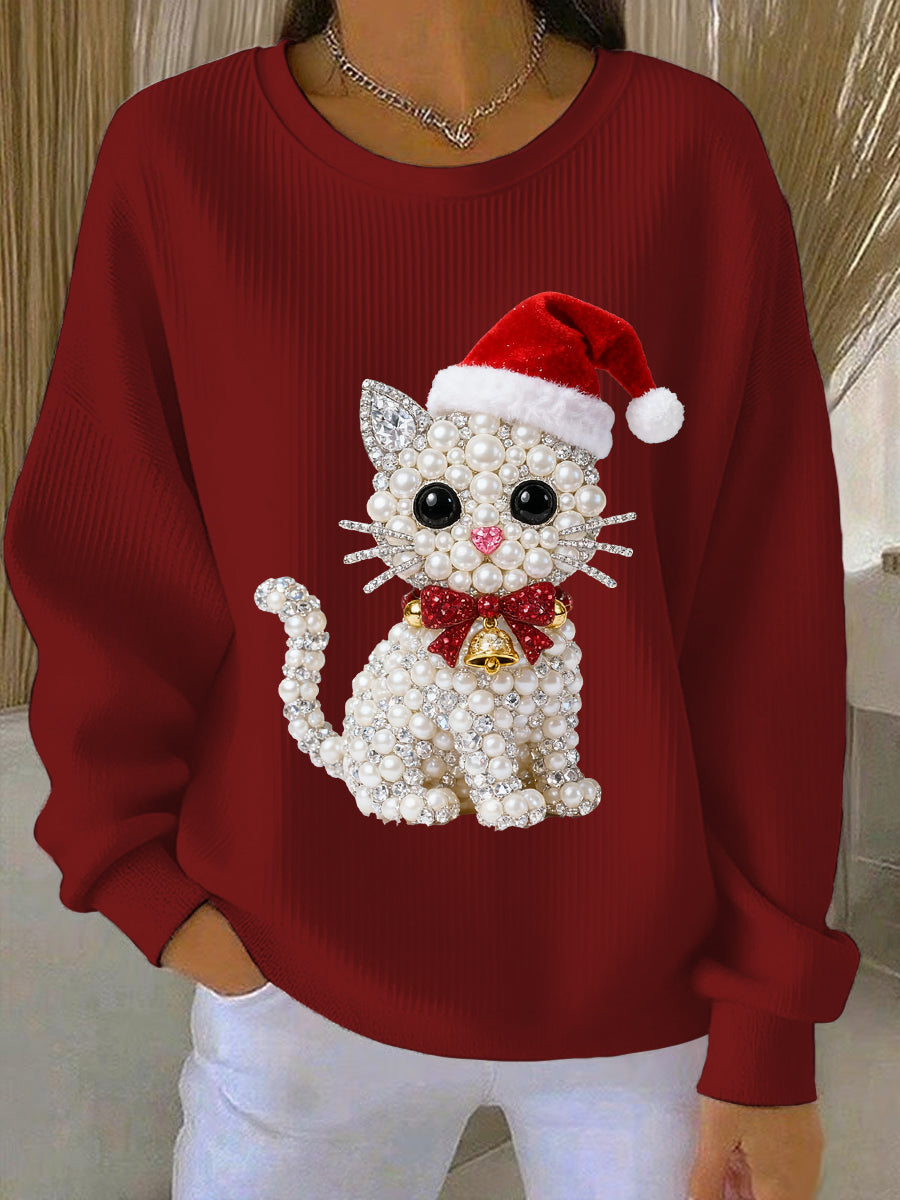 Women's Christmas Cat Art Ribbed Round-Neck Sweatshirt