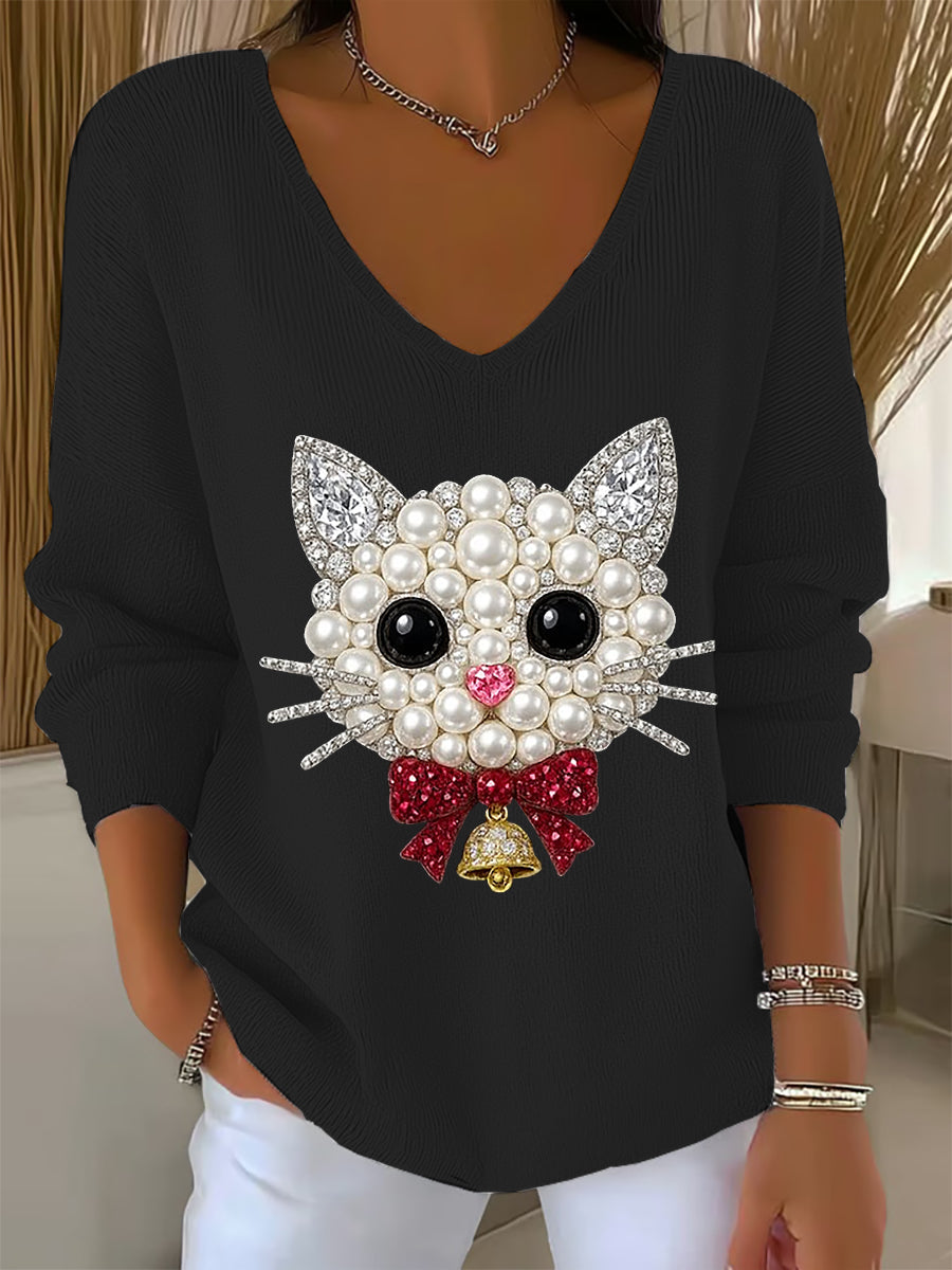 Women's Christmas Cat Art V-Neck Ribbed Top