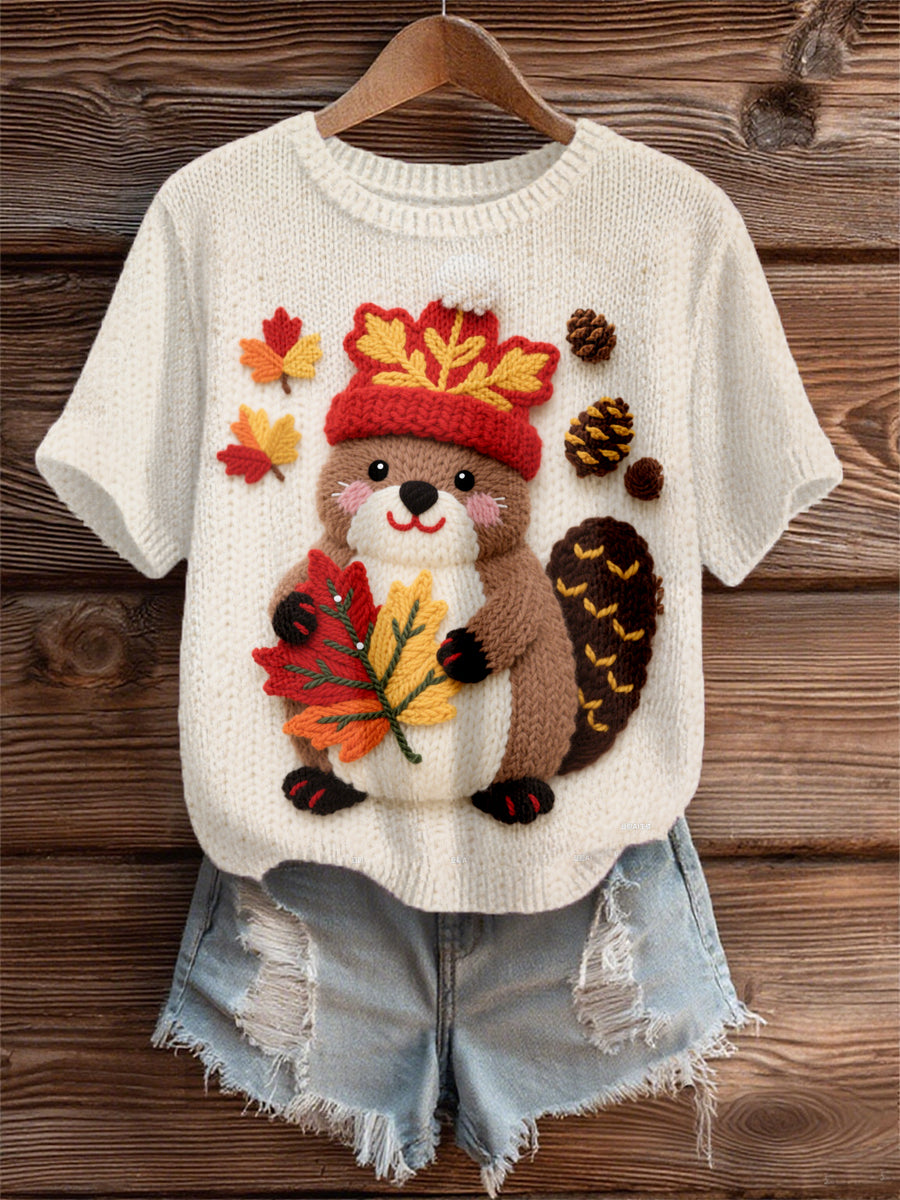 Women's Cute Canadian Beaver Maple Leaf Print Casual Tee