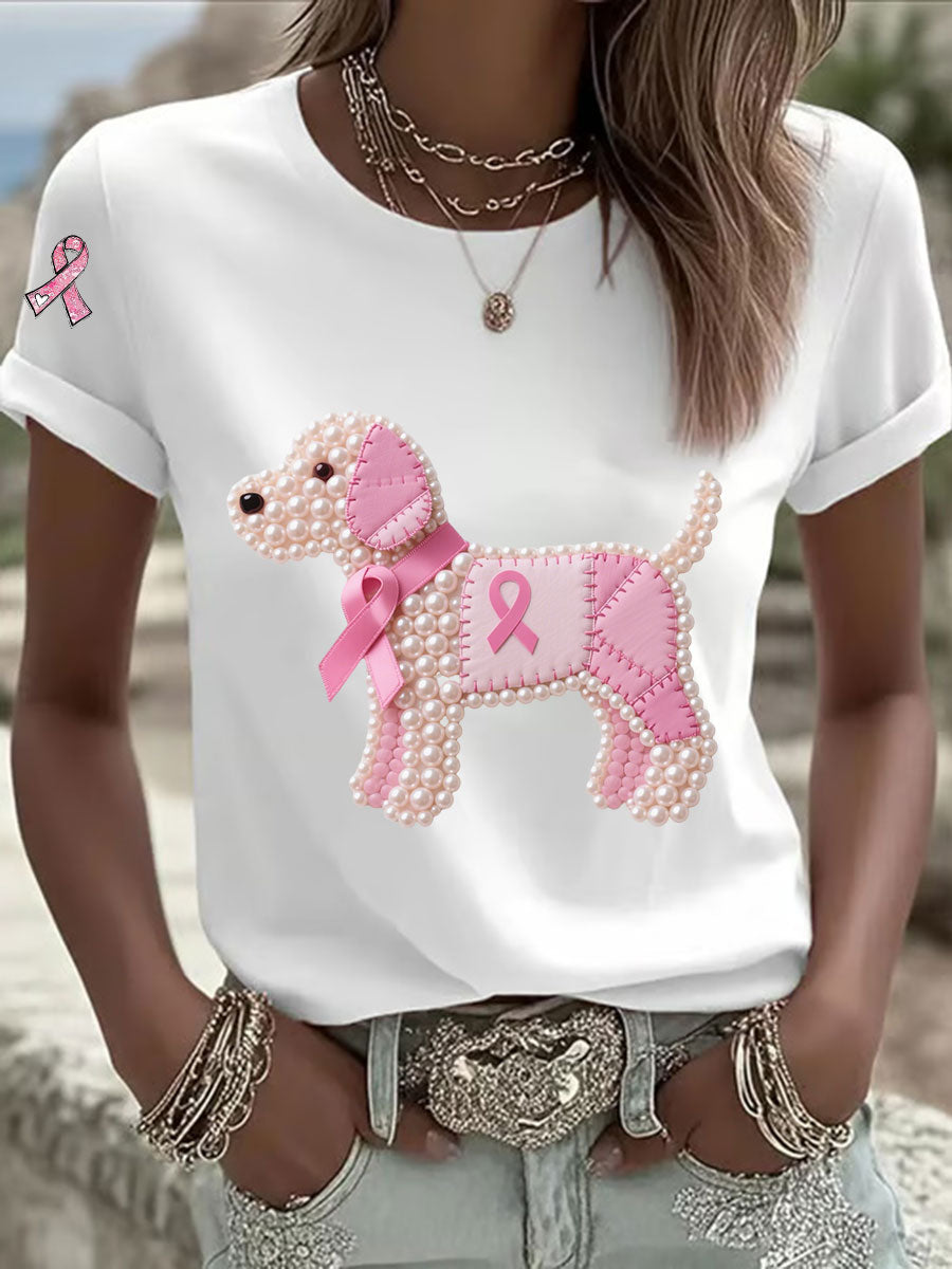 Women's Pink Ribbon Pearl Dog Print Casual T-shirt