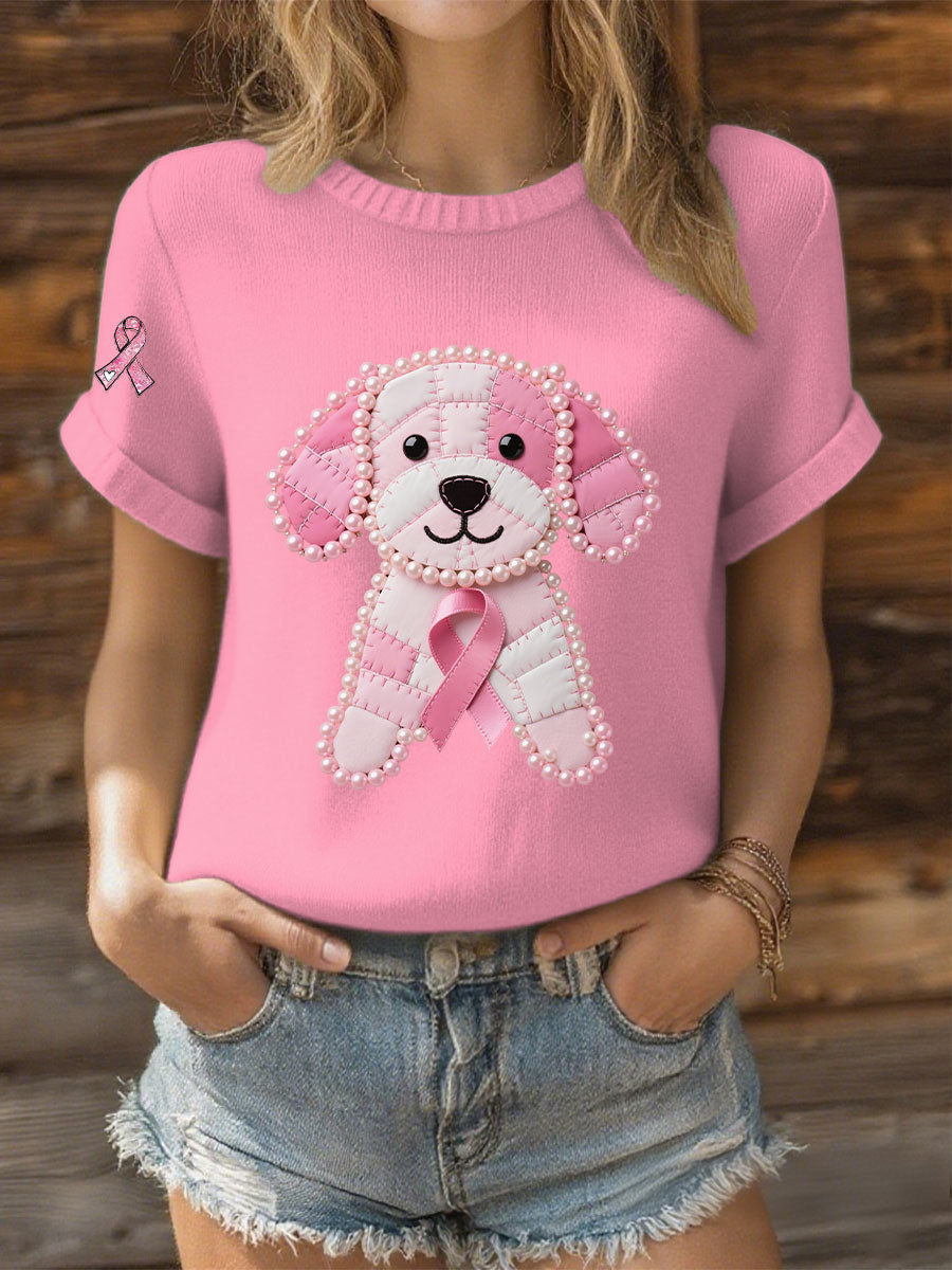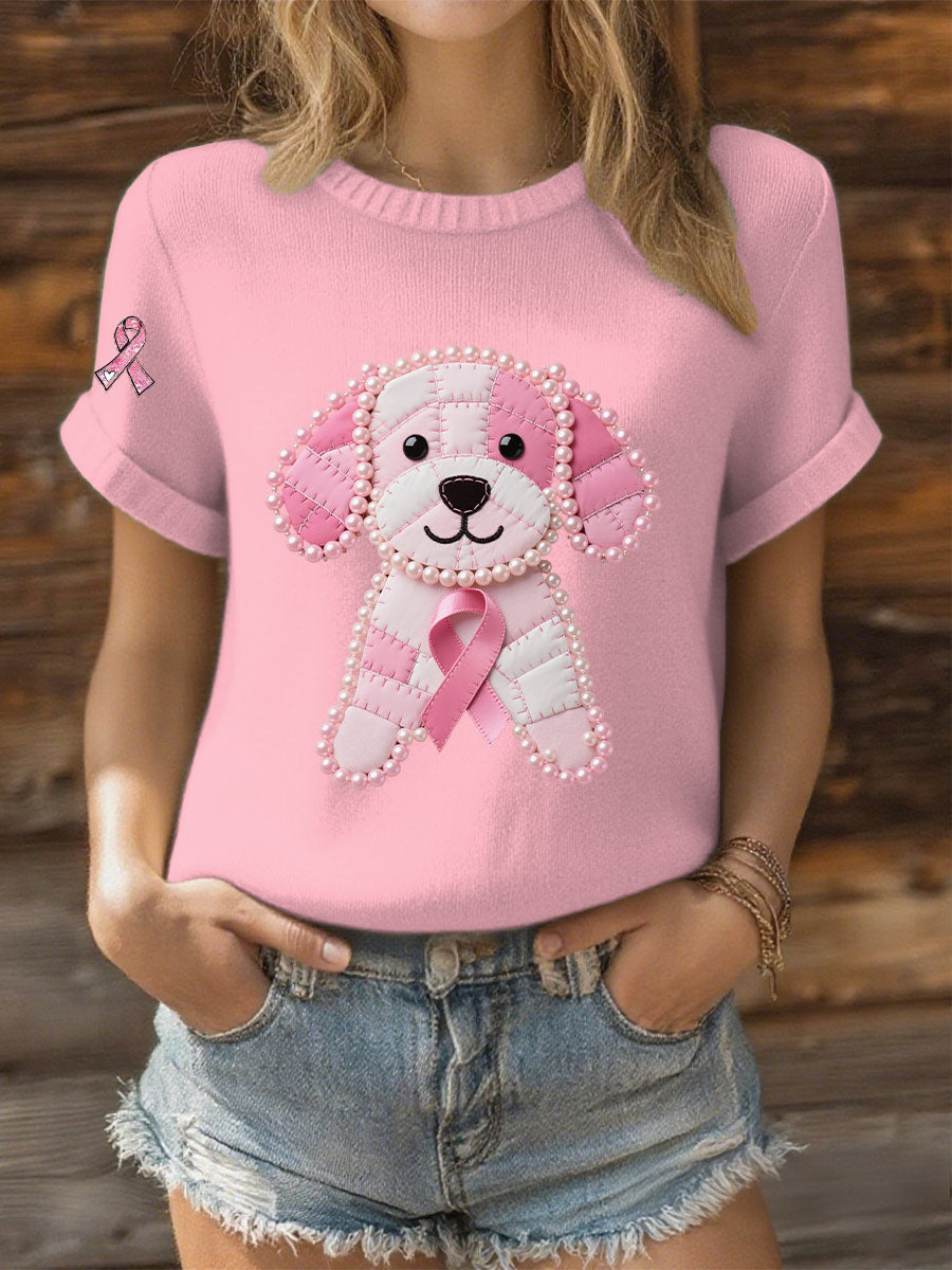 Women's Pink Ribbon Pearl Dog Print Casual T-shirt